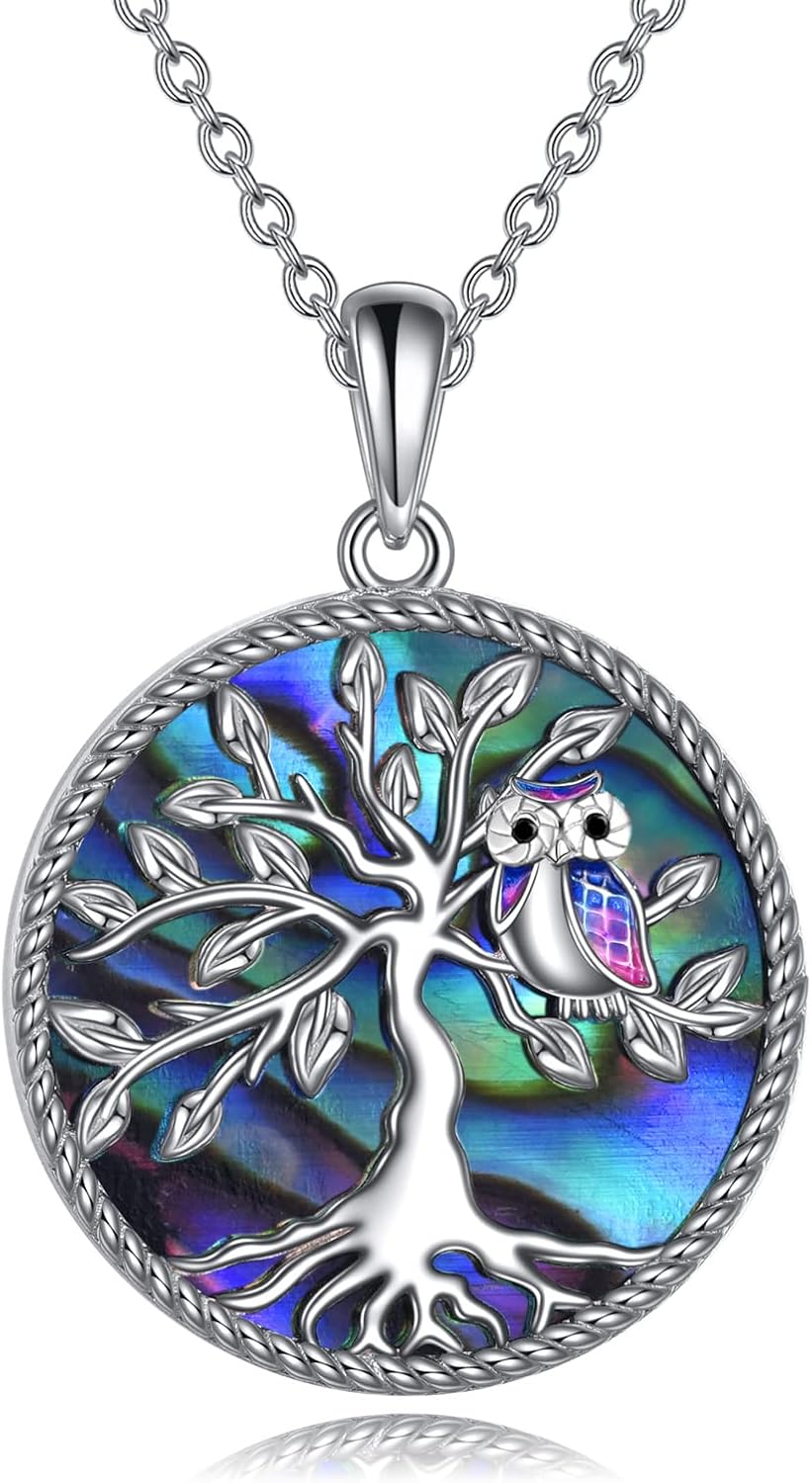 YFN Owl Tree of Life Pendant Necklace Sterling Silver Owl Jewelry Abalone Bird Christmas Birthday Gifts for Women