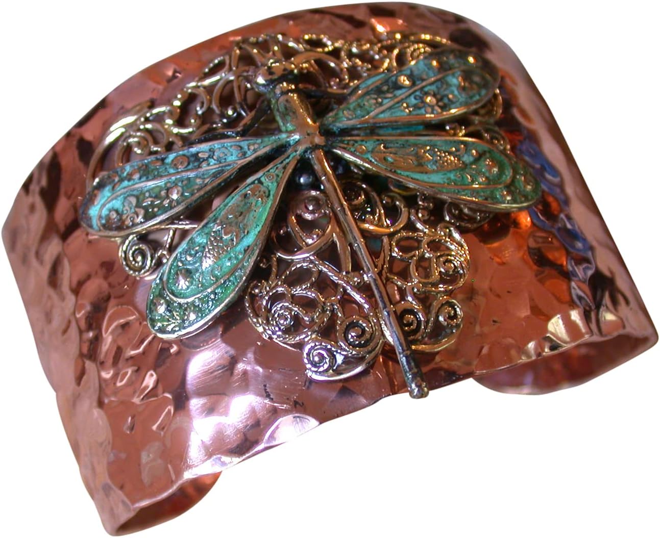 Elaine Coyne Wearable Art Forged Copper and Patina Brass Neo-Victorian Dragonfly on Filigree Cuff Bracelet