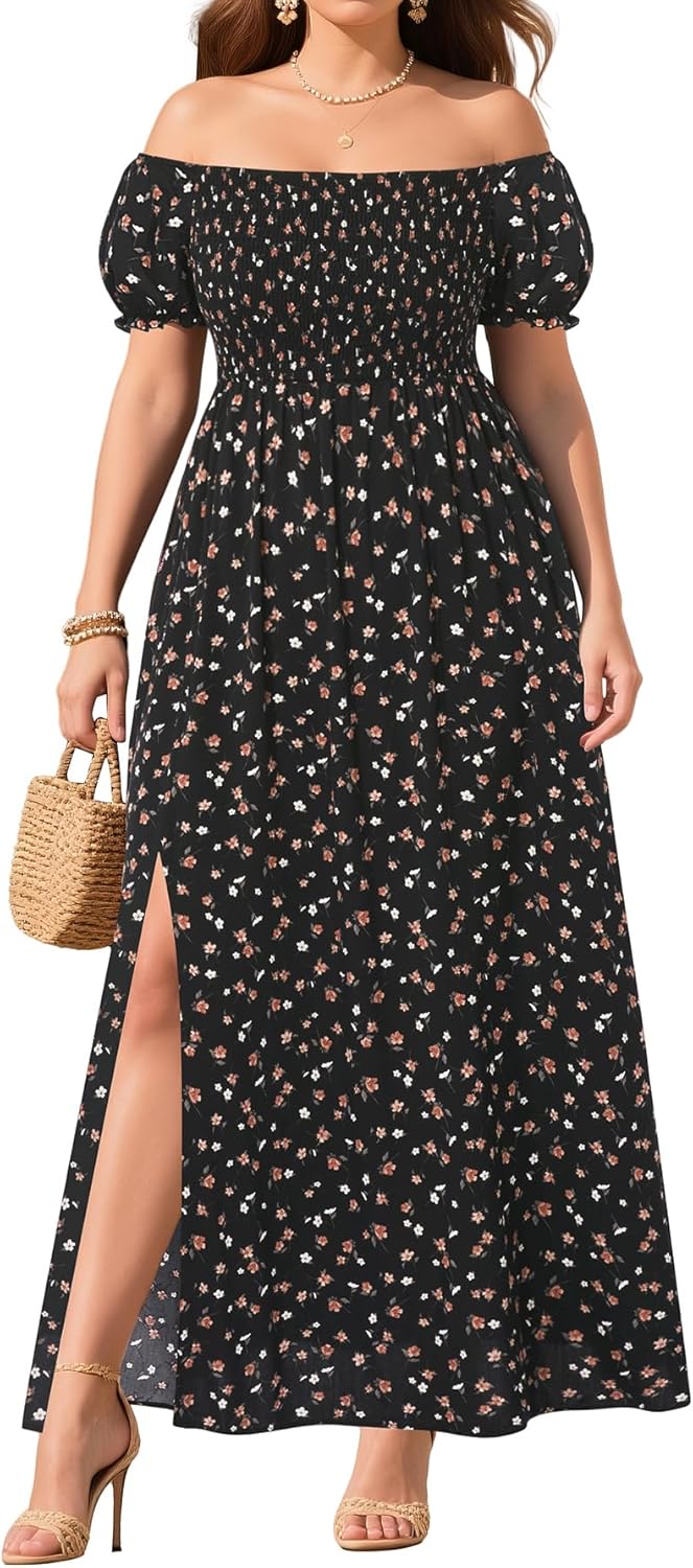 Pinup Fashion Women's Plus Size Summer Maxi Dress Floral Black Off Shoulder Boho Casual Beach Smocked Long Flowy Dresses with Pockets