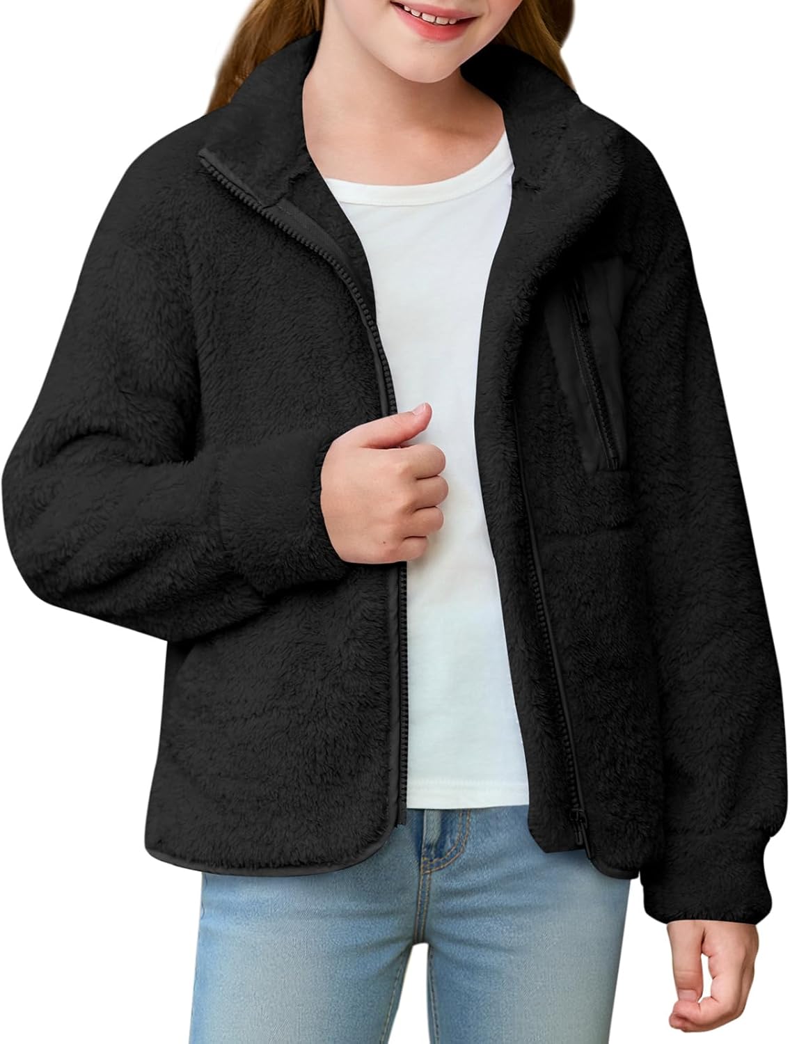 Haloumoning Girls Fuzzy Fleece Jacket Kids Sherpa Zip Up Fall Winter Coat Outerwear with Pockets 5-14 Years