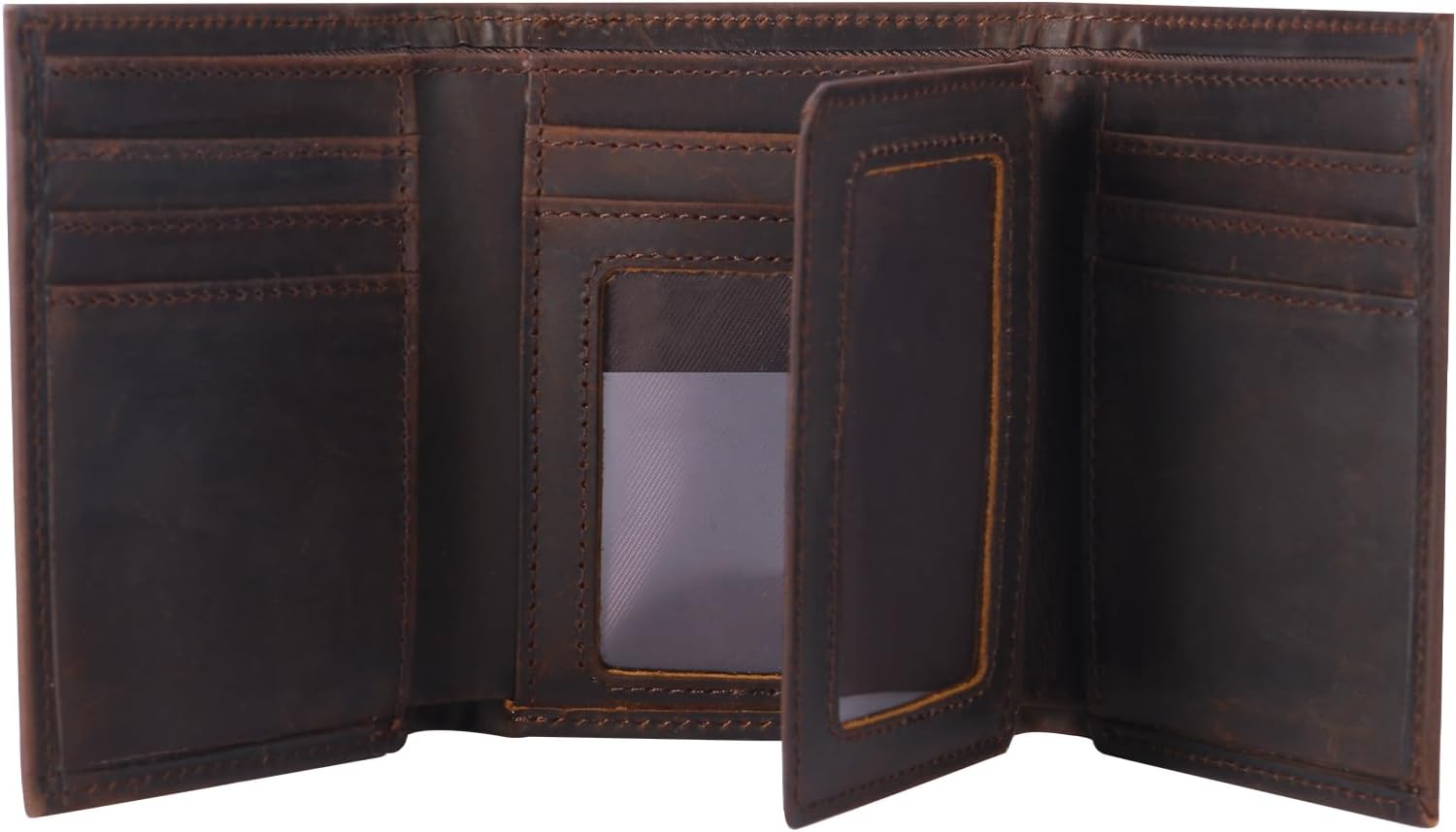 Mens Trifold Crazy Horse Leather Wallet with 11 card Slots, Genuine Leather RFID Blocking Wallet for Men(brunet brown)