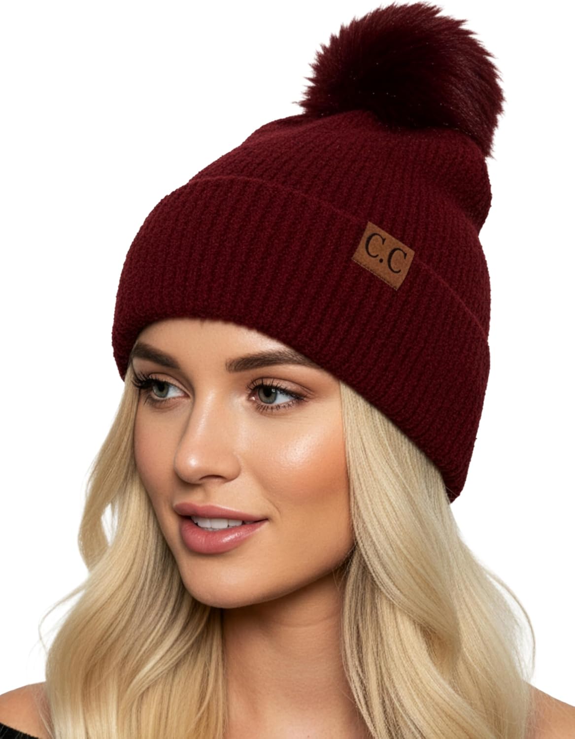 Funky Junque Beanie for Women Ultra Soft Chenille Faux Fur Pom Pom Winter Hats Warm Ski Cap Fashion