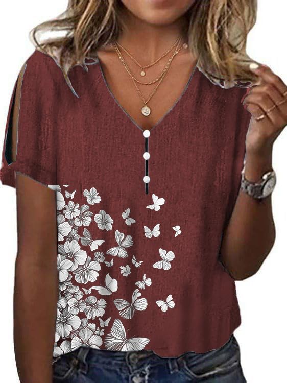 Women's Boho Butterfly Floral Print Cold Shoulder Flowy Tops Summer Dressy Casual V Neck Ladies Blouses Tunic Tops