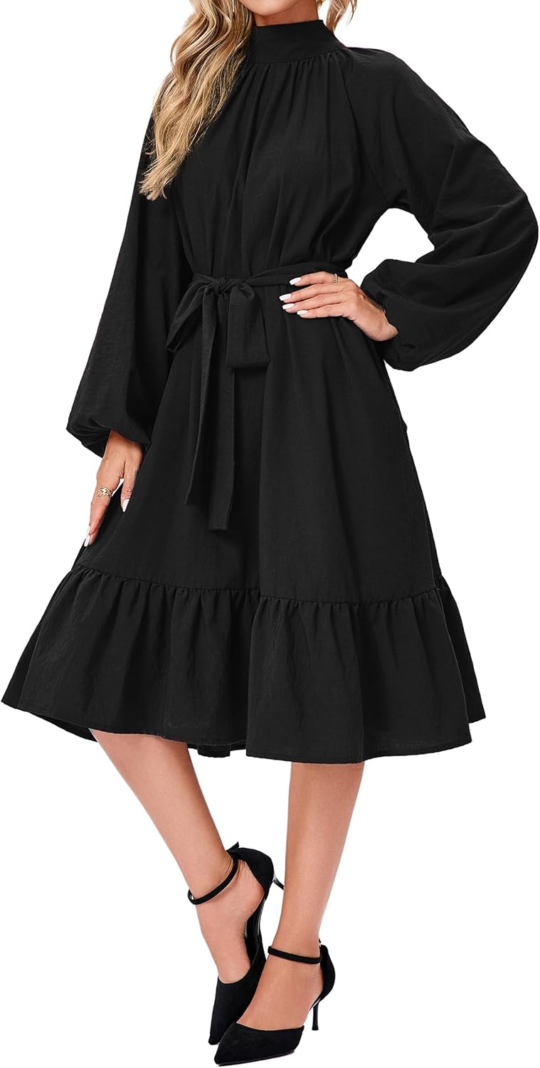 Women's 2026 Spring Dresses Long Sleeve Elegant Crew Neck A-Line Elastic Wasit Lightweight Formal Casual Midi Dress