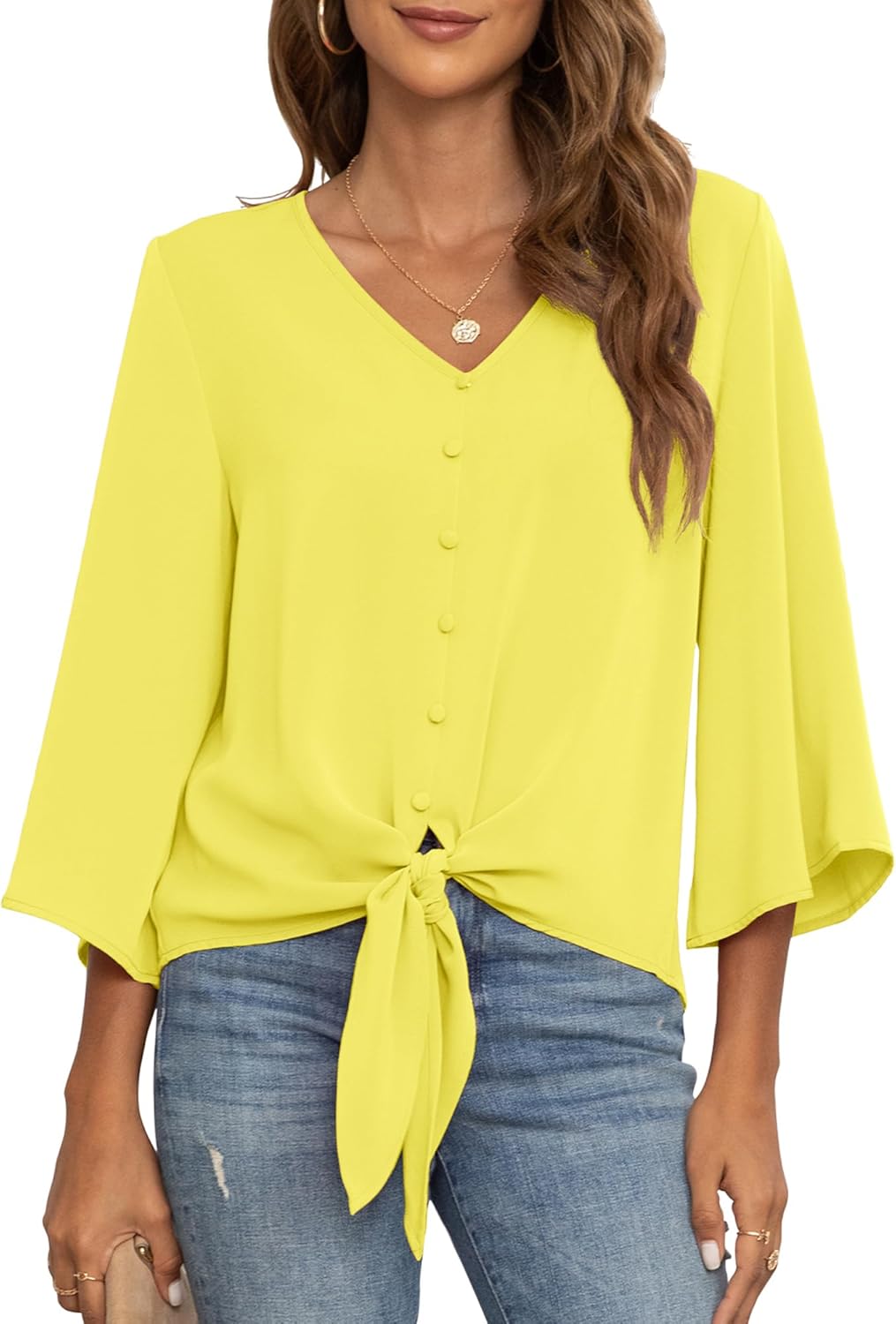 VIISHOW Women's Button V Neck Chiffon Tops 3/4 Bell Sleeve Tie Knot Casual Blouses Loose Summer Shirts