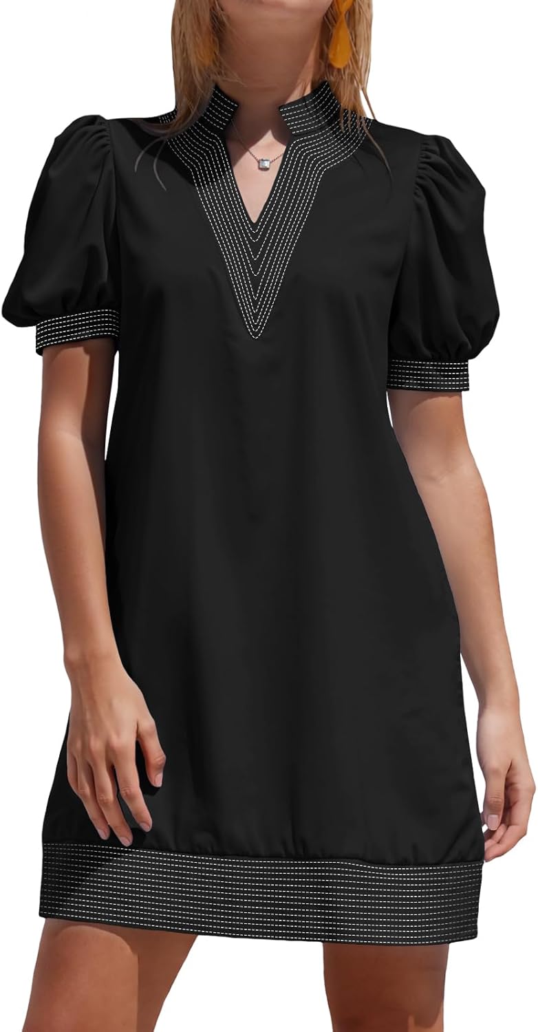 YUNDAI Women's Puff Sleeve V-Neck Shift Dress with Pockets,Casual Loose Fit Tunic Dress