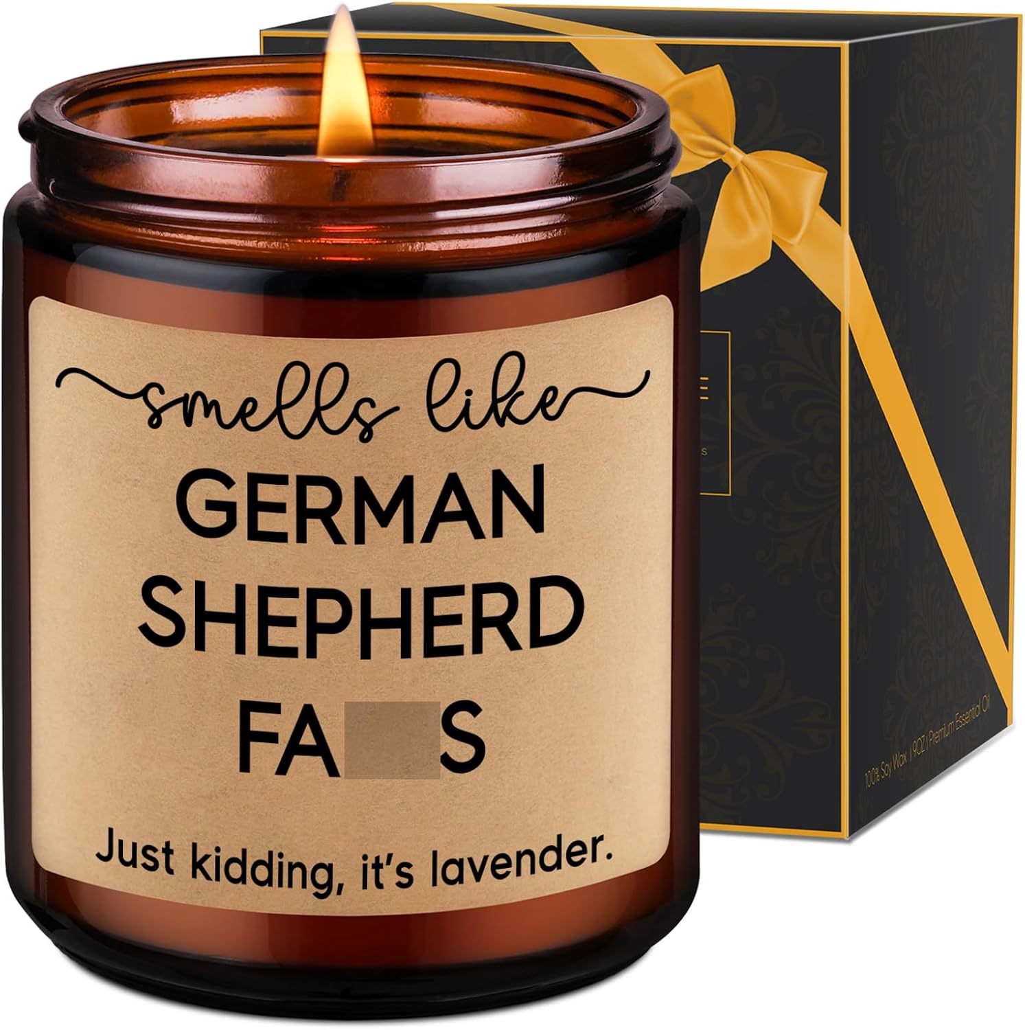 - German shepherd gifts: Printing with saying “Smells like german shepherd fa*ts; Just kidding, it’s lavender,” our scented candle makes an ideal present for anyone whose shepherd is always f*rting; A funny present for a shepherd owner, dog groomer friend, dog-loving family member, fur mom, father, grandma, sister, aunt, friend or anyone who has a german shepherd