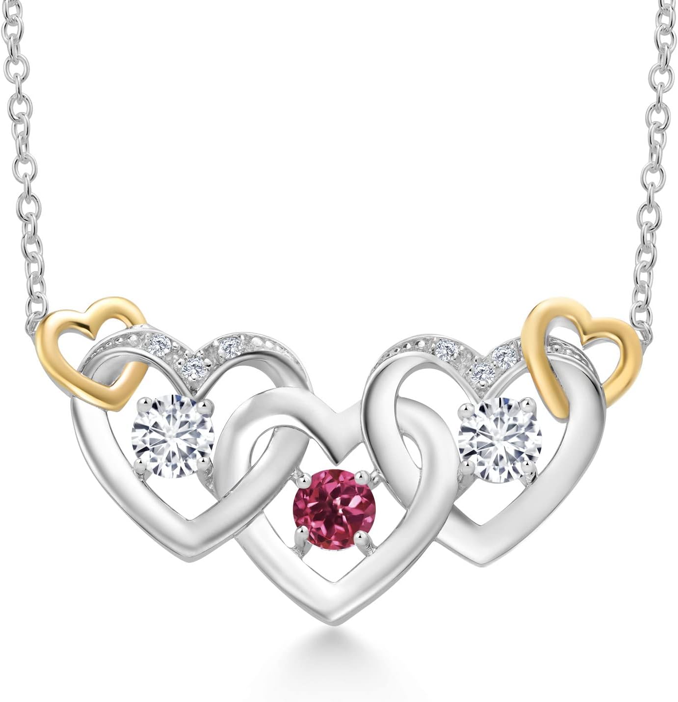 Gem Stone King 925 Silver and 10K Yellow Gold Pink Tourmaline and White Lab Grown Diamond Heart Shape Pendant Necklace For Women (0.85 Cttw, with 18 Inch Chain)