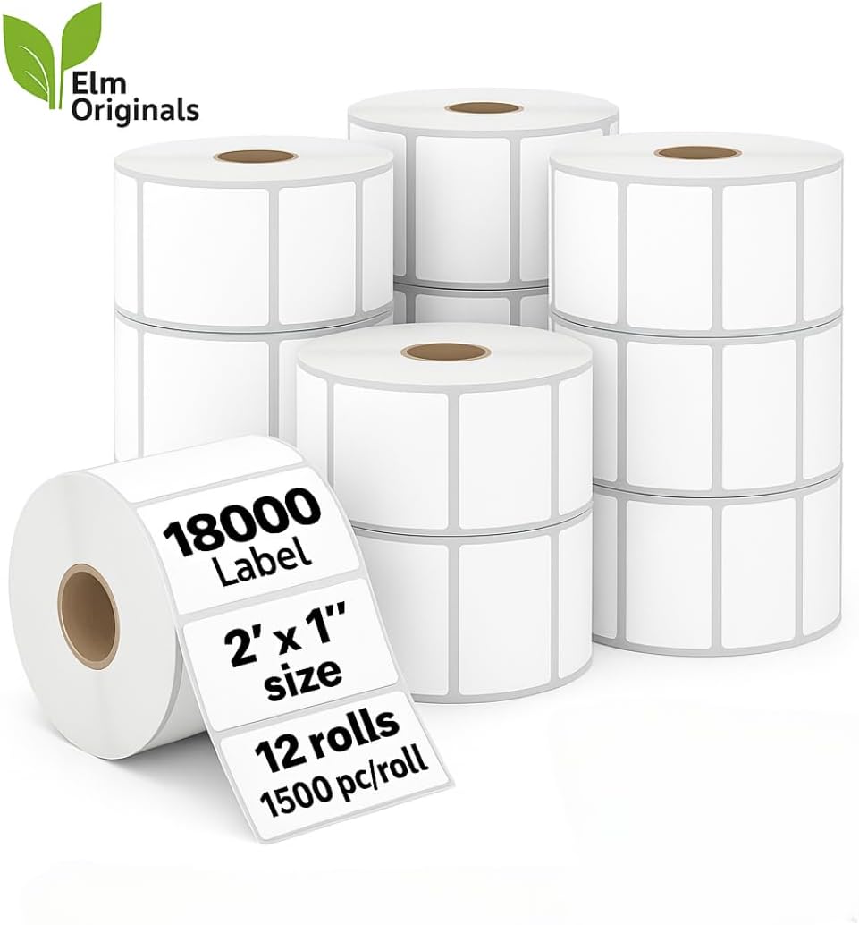 2" x 1" Direct Thermal Labels for Barcodes Address Shipping - Bright White Paper Compatible with Rollo Zebra Munbyn Desktop Printers (12 Rolls, 1500 Labels/Roll) - Elm Originals