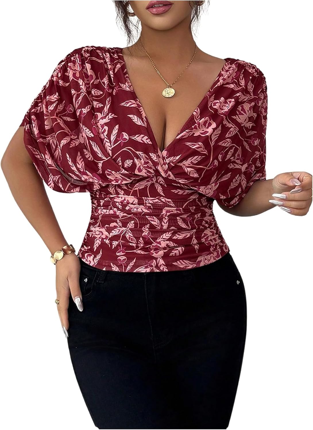 Floerns Women's Floral Dolman Sleeve Boho Tops Deep V Neck Ruched Vacation Blouse Tops