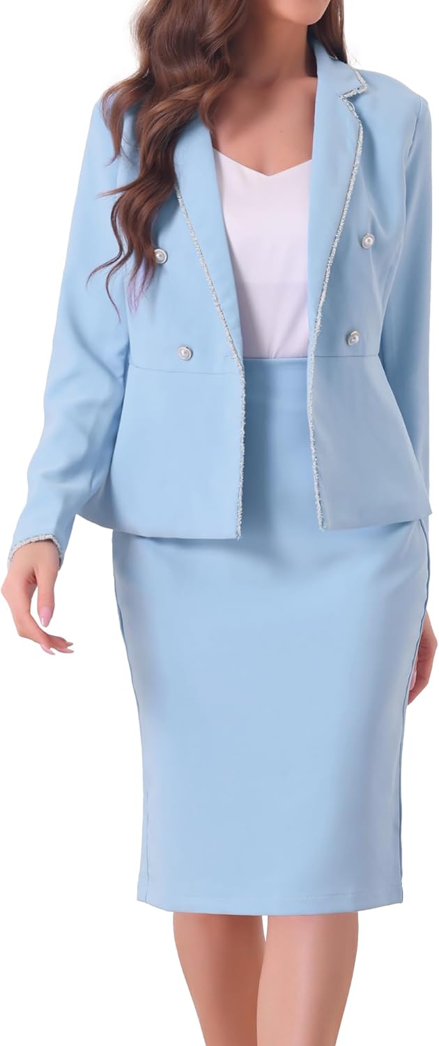 Allegra K Women's 2 Piece Skirt Sets Tweed Trim Long Sleeve Blazer Pencil Skirt Business Suits Work Outfits