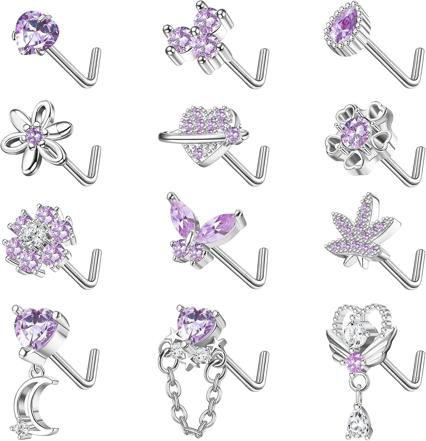 Sanfenly 12 PCS 20G Nose Rings Surgical Stainless Steel, L Shaped Nose Studs for Women Men, CZ Heart Butterfly Flower Leaf Moon Dangle Cute Nose Piercings Studs Screw Jewelry Pink/Purple/Blue/Clear