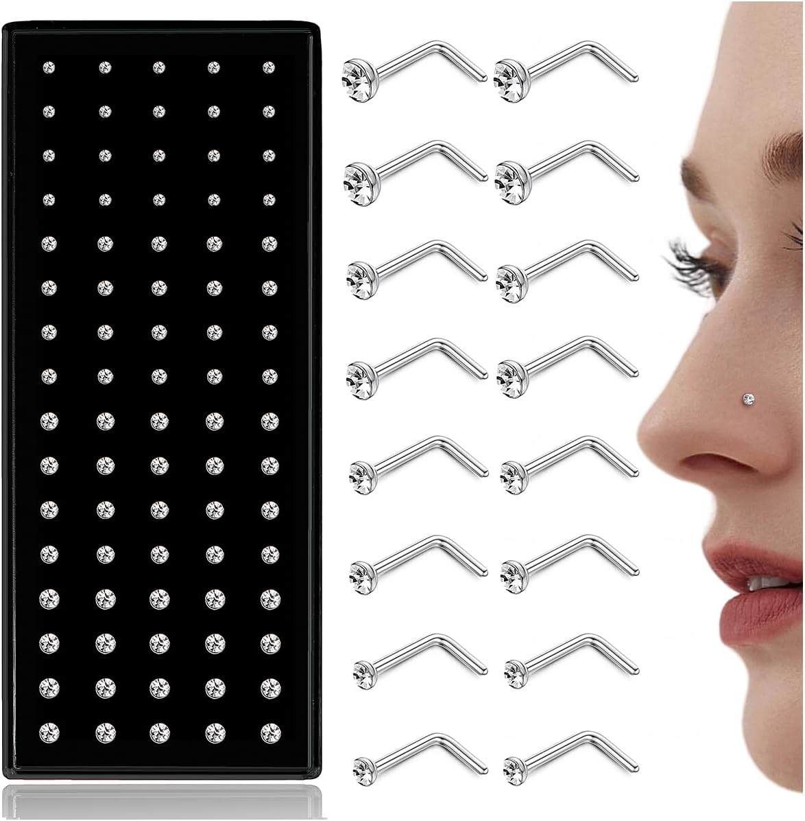 LOLIAS 80-160Pcs Nose Rings Studs for Women Men - Straight or L Shaped Surgical Stainless Steel Small Nose Studs Pin - Hypoallergenic 20G 22G Tiny Nose Piercing Jewelry 1.5/2/2.5/3 mm CZ