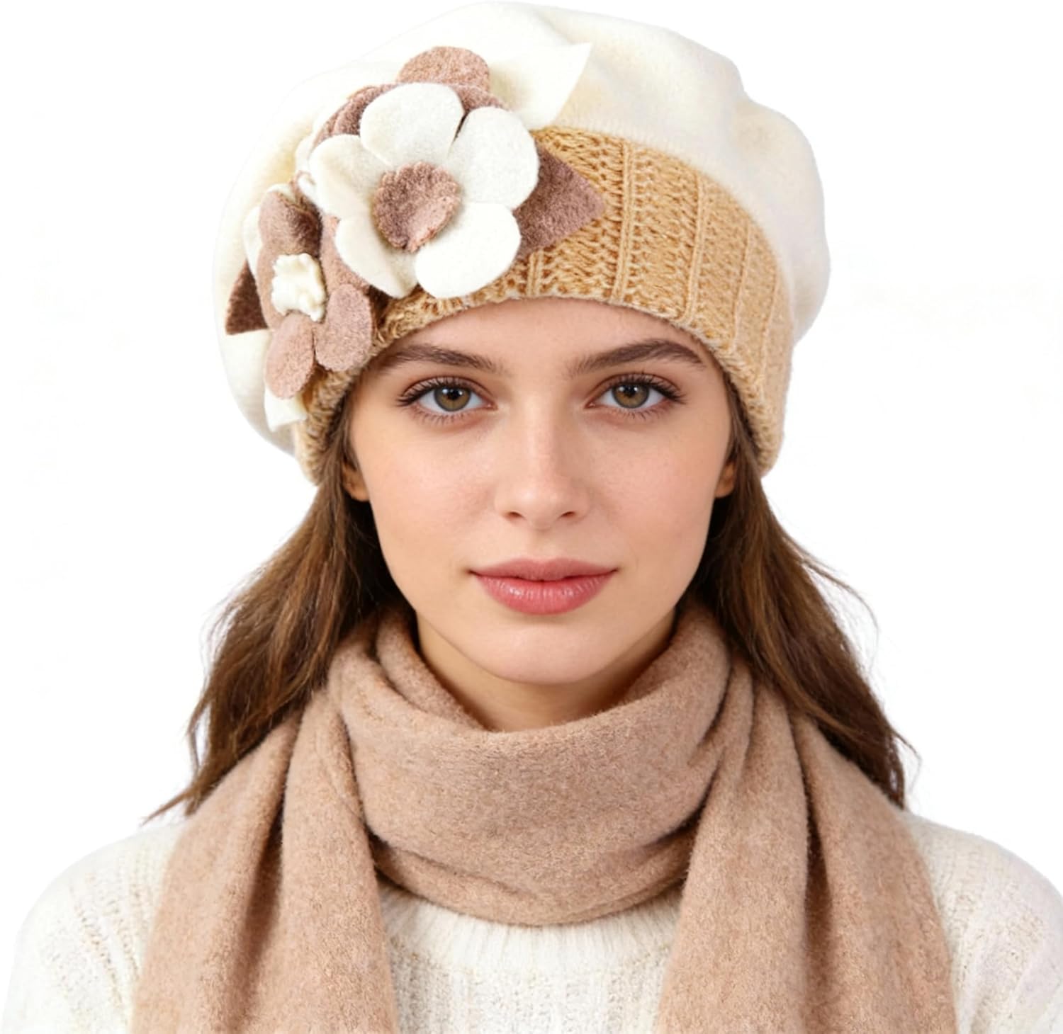 SATINIOR 6 Pieces Wool Beret Hat with Silky Scarf Brooch Solid Color French Beanie Hat for Women
