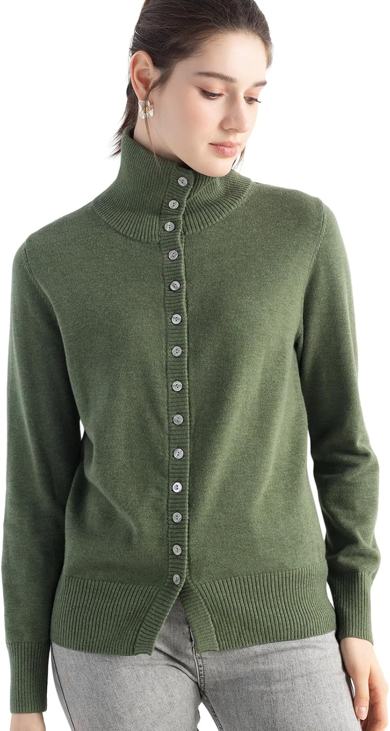 Women's Merino Wool Blend Cardigan 2025 Fall Winter Casual Mock Neck Long Sleeve Knit Cardigan with Buttons