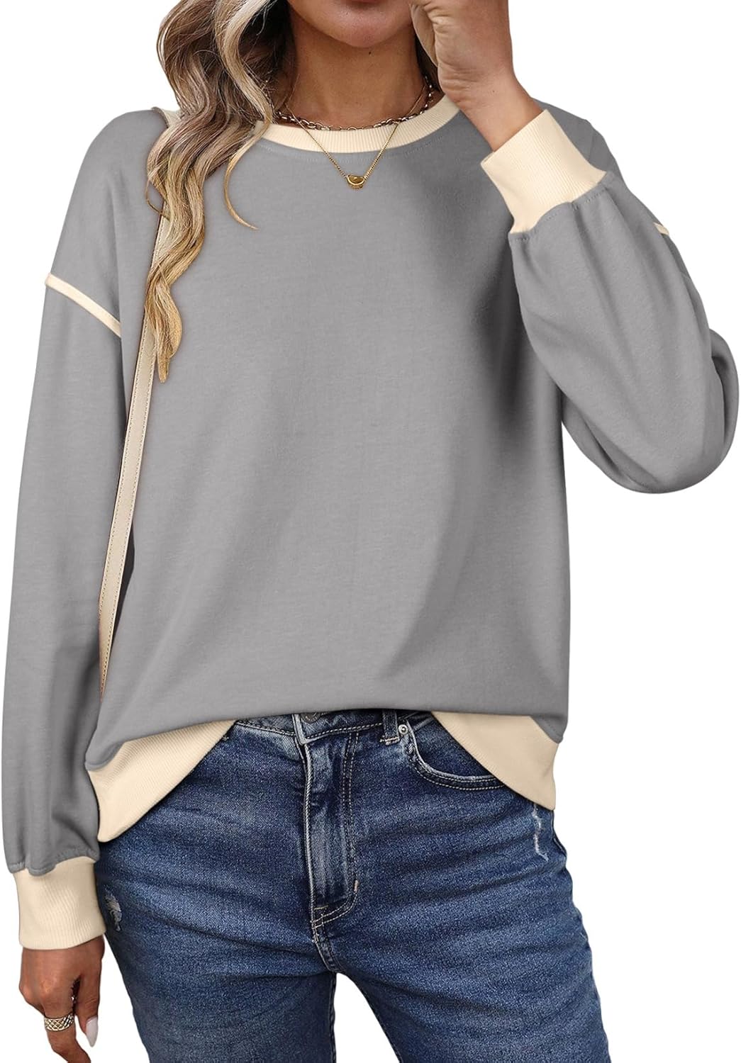 SHEWIN Womens Sweatshirt Casual Long Sleeve Lightweight Crewneck Sweatshirts Loose Solid Contrast Trim Pullover Tops