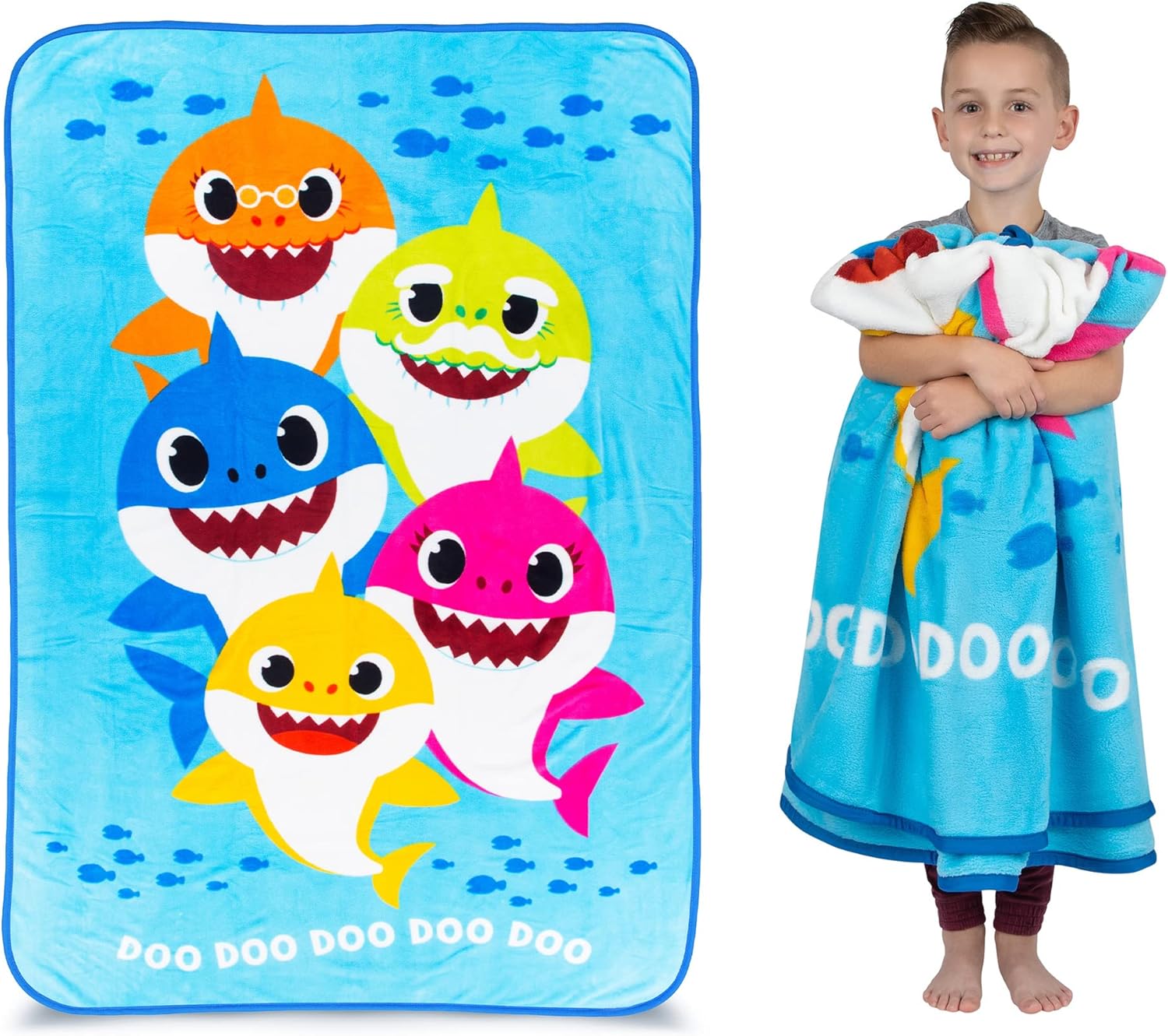 - BABY SHARK DESIGN: Let your little one sing their heart out with this plush blanket featuring Baby Shark, Grandpa Shark, Daddy Shark, Grandma Shark, and Mommy Shark.