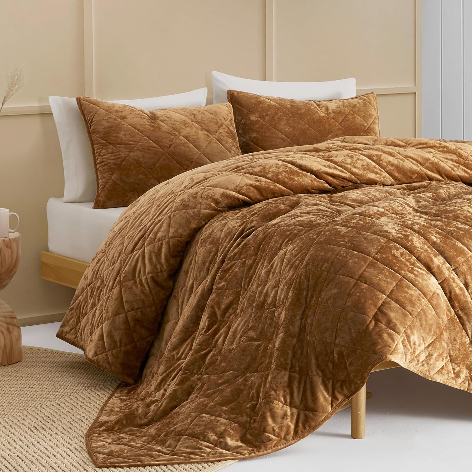 Wonderful Luxury Velvet Caramel Quilt Set, King Diamond Stitch Pattern Bedding,Lightweight Ultra-Soft Skin-Friendly,All-Season,Versatile as Comforter/Bedspread for Adults Teens Kids Bedroom,106"x94"