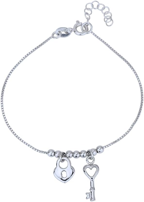 Vanbelle Sterling Silver Jewelry - Rhodium Plated with 925 Stamp - Hanging Lock & Key Bracelet - Elegant Handcrafted - for Women - 6.5" long + 1" extender