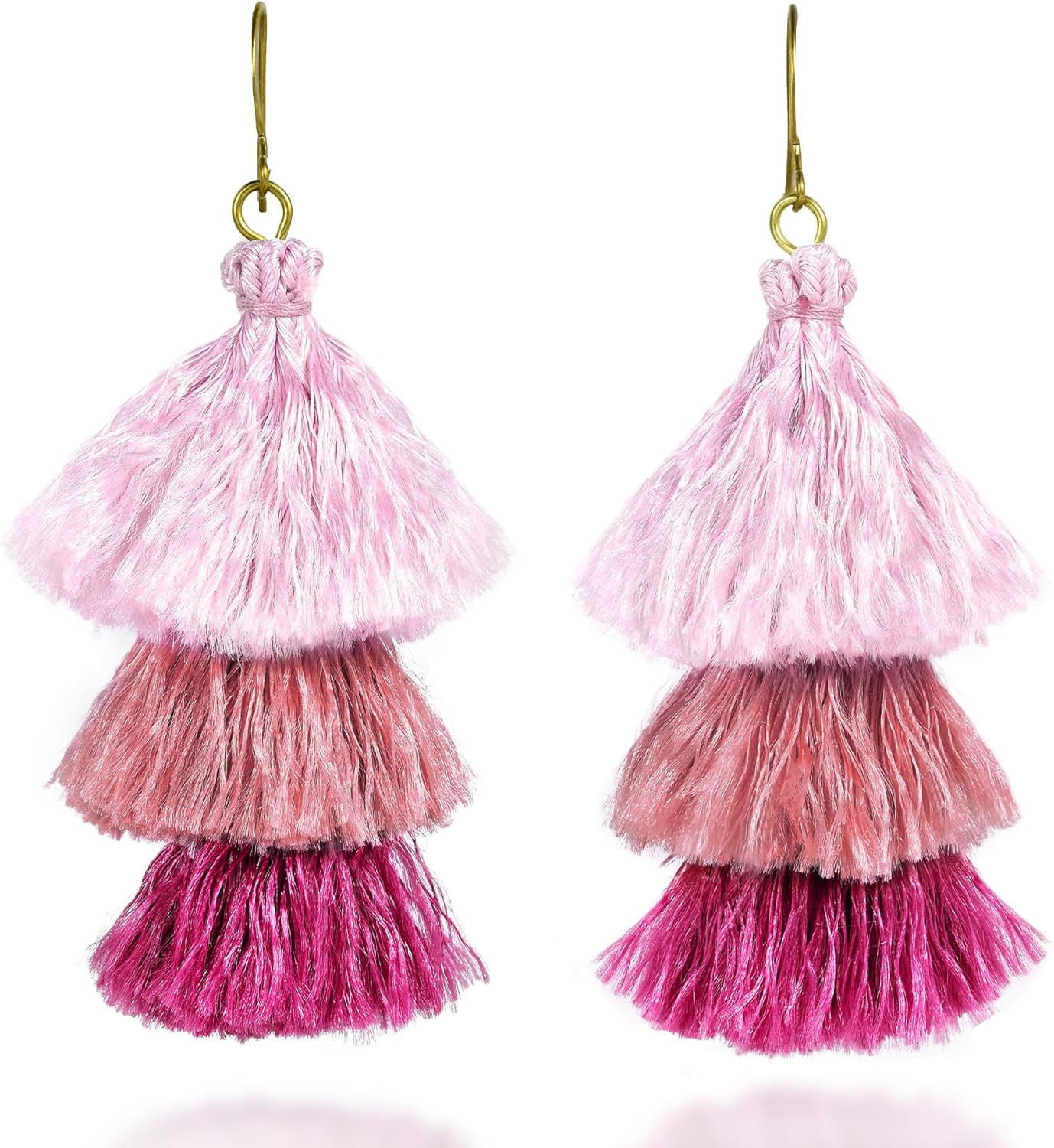 AeraVida Amazing Layered Triple Stack of Pink Tassels & Brass Dangle Earrings | Boho Chic Statement Earrings for Women | Bold Tassel and Brass Jewelry