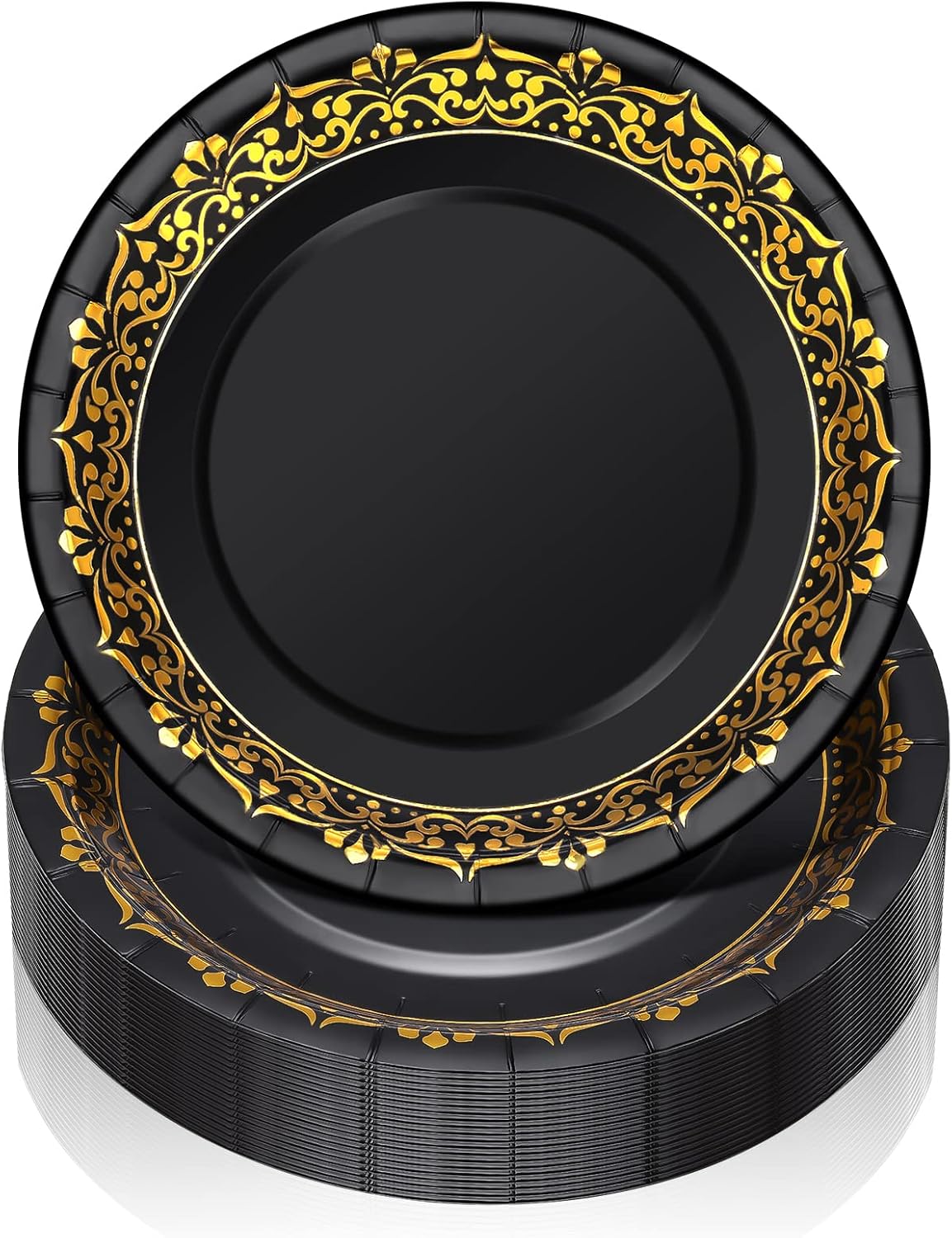 - Wide Applicable: the black and gold disposable plates for wedding are designer sleek, modern and stylish. They are perfect black cake plates for birthday, baby shower, wedding, formal dinners, banquets, parties, picnics, catering supplies or holiday, just about anywhere