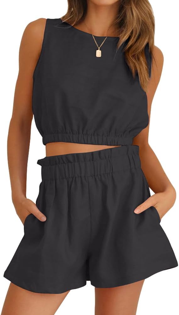 FANCYINN Women Summer 2 Piece Outfits Casual Crop Top Tank Sleeveless and Elastic Waist Pants Short Sets With Pocket