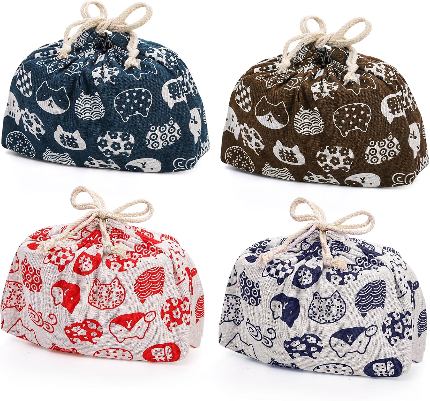 Youeon 4 Colors Japanese Cat Lunch Bags, Double Cotton Linen Lunch Tote Pouch with Drawstring Closure, Reusable Cute Storage Bags for Office, Picnic, School, Travel