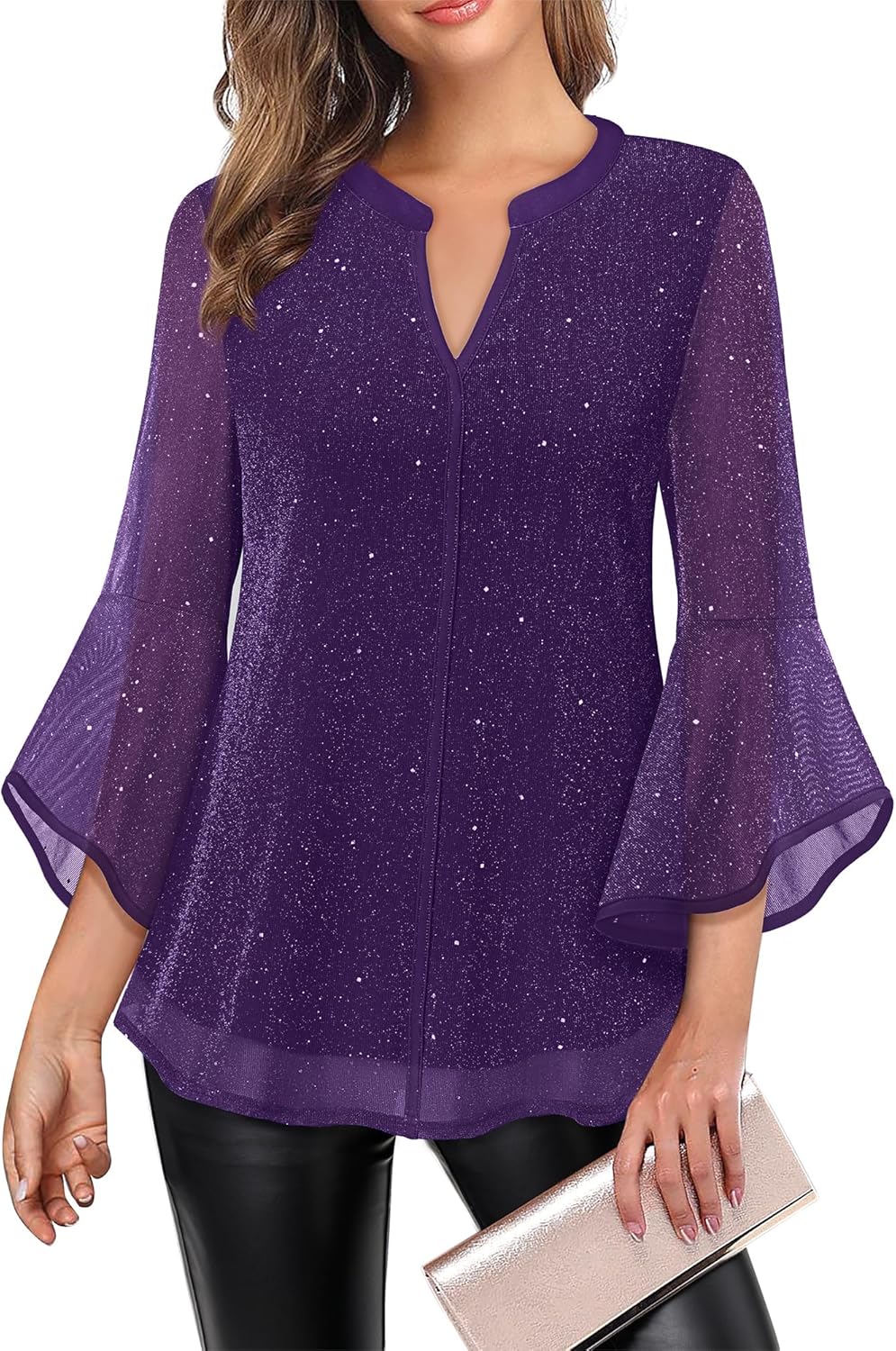 VALOLIA Women's 3/4 Sleeve Dressy Blouses Shirts Casual Loose Fit Mesh Layered Flowy Tunic Tops