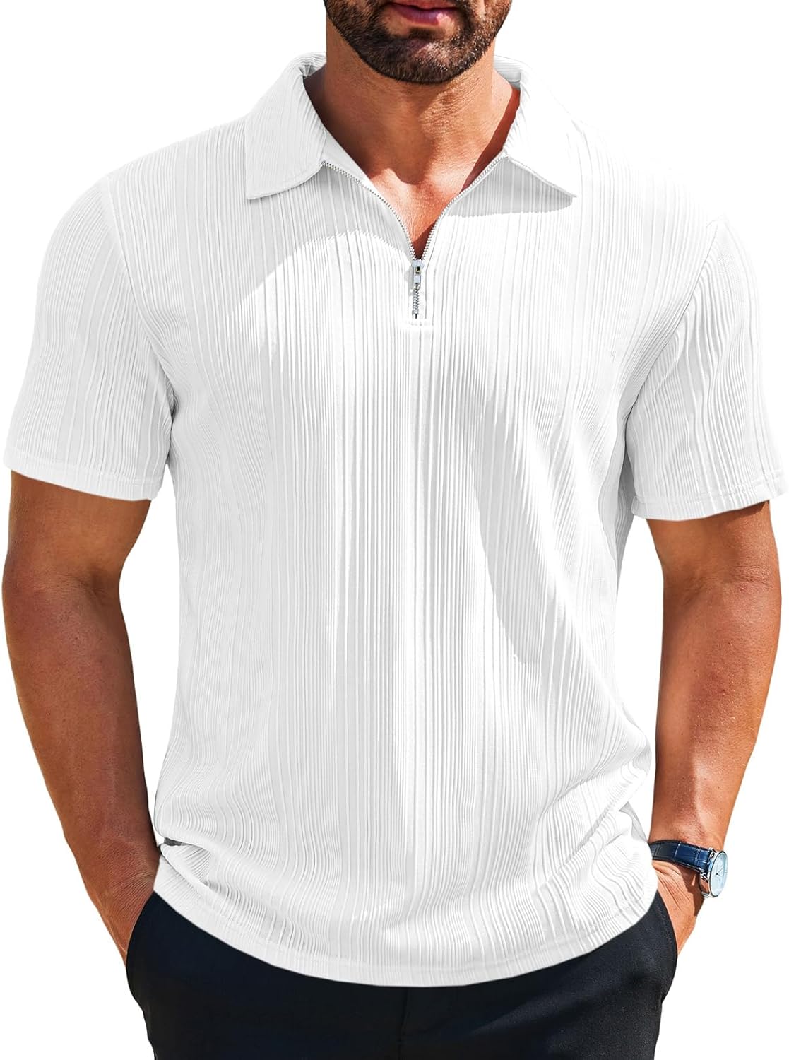 Runcati Mens Quarter Zip Polo Shirts Knit Textured Casual Short Sleeve Shirt Lightweight Golf Tops