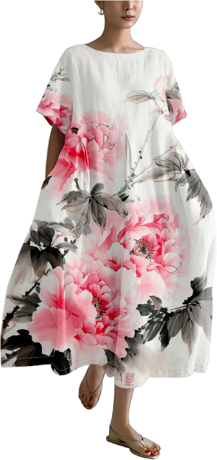 Maxi Dresses for Women 2024 Japanese Art Floral Print Crew Neck Short Sleeve Casual Boho Oversized Dress