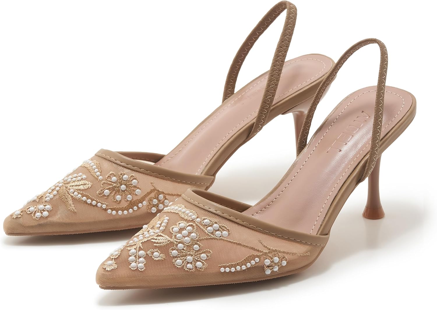Embroidered Mesh Slingback Heels for Women White Pearl Kitten Heel Pumps Pointed Toe Backless Wedding Shoes