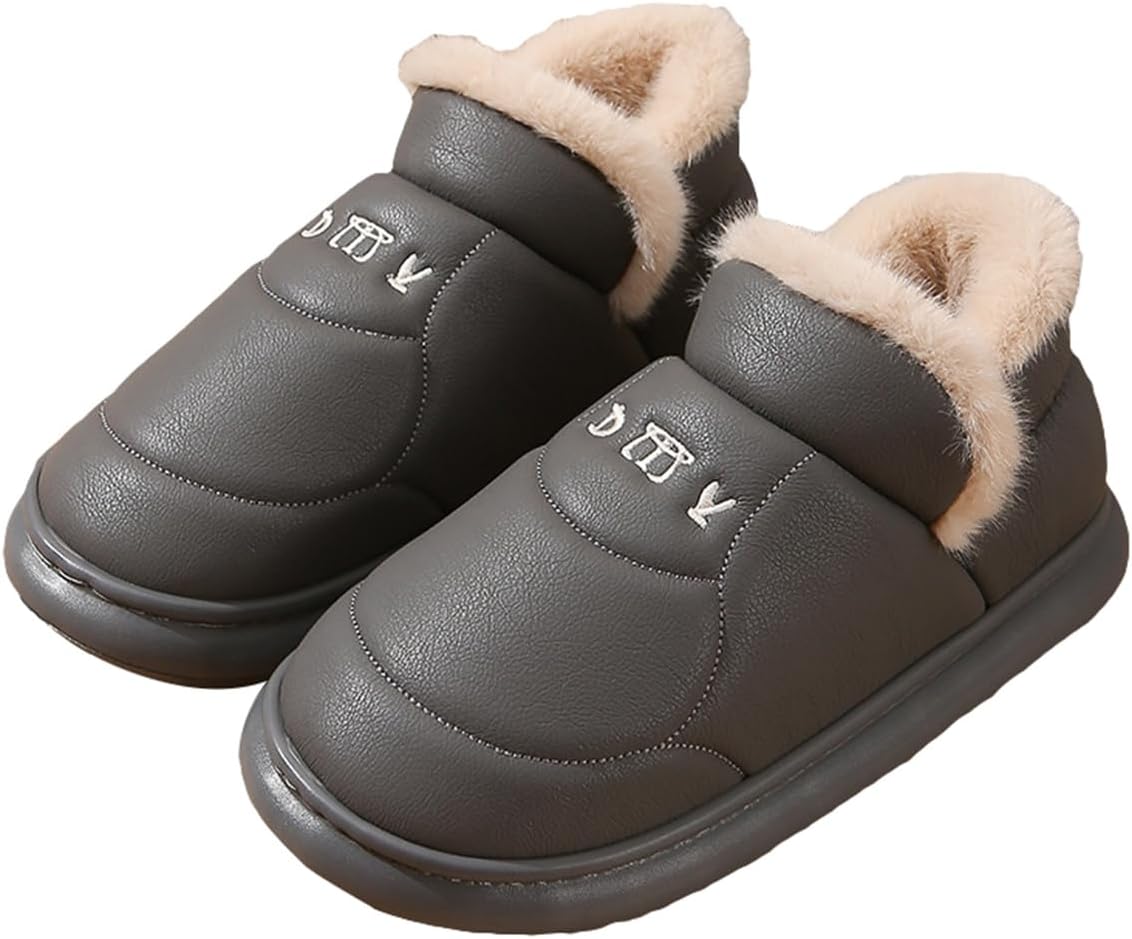 Plush Lined Home Slippers for Women Men Winter Non-Slip Waterproof PU Warm House Booties Indoor Outdoor Shoes