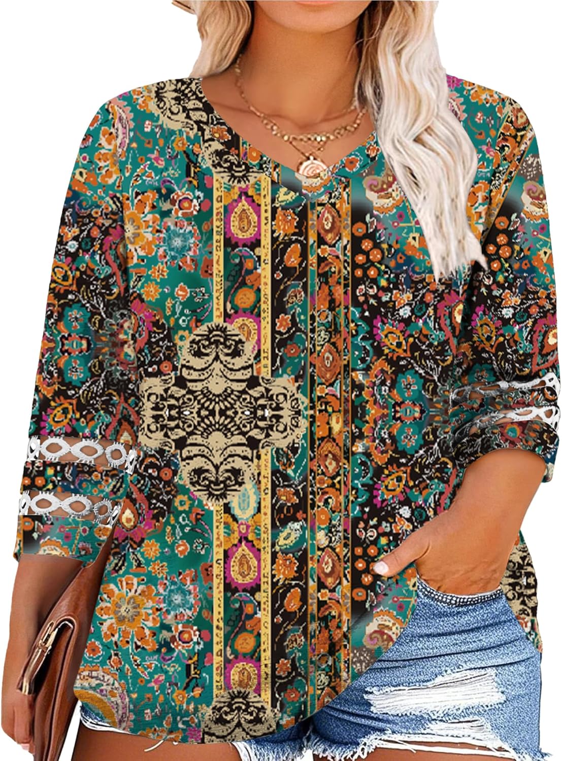 Chulianyouhuo Womens Plus Size Tops 3/4 Lace Sleeve Dressy Casual Blouses Trendy V Neck T Shirts Loose Fit Tees Tunic