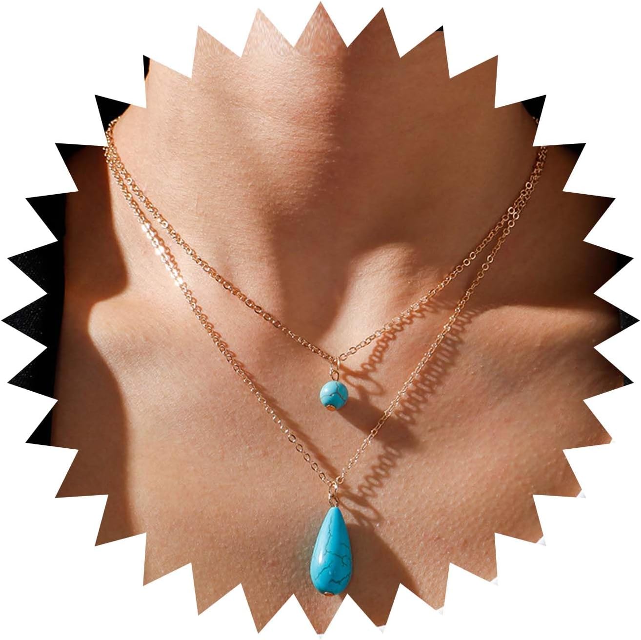 Andelaisi Boho Layered Turquoise Choker Necklace Gold Teardrop Turquoise Necklace Choker Blue Turquoise Pendant Necklace Vintage Waterdrop Turquoise Necklace Jewelry for Women
