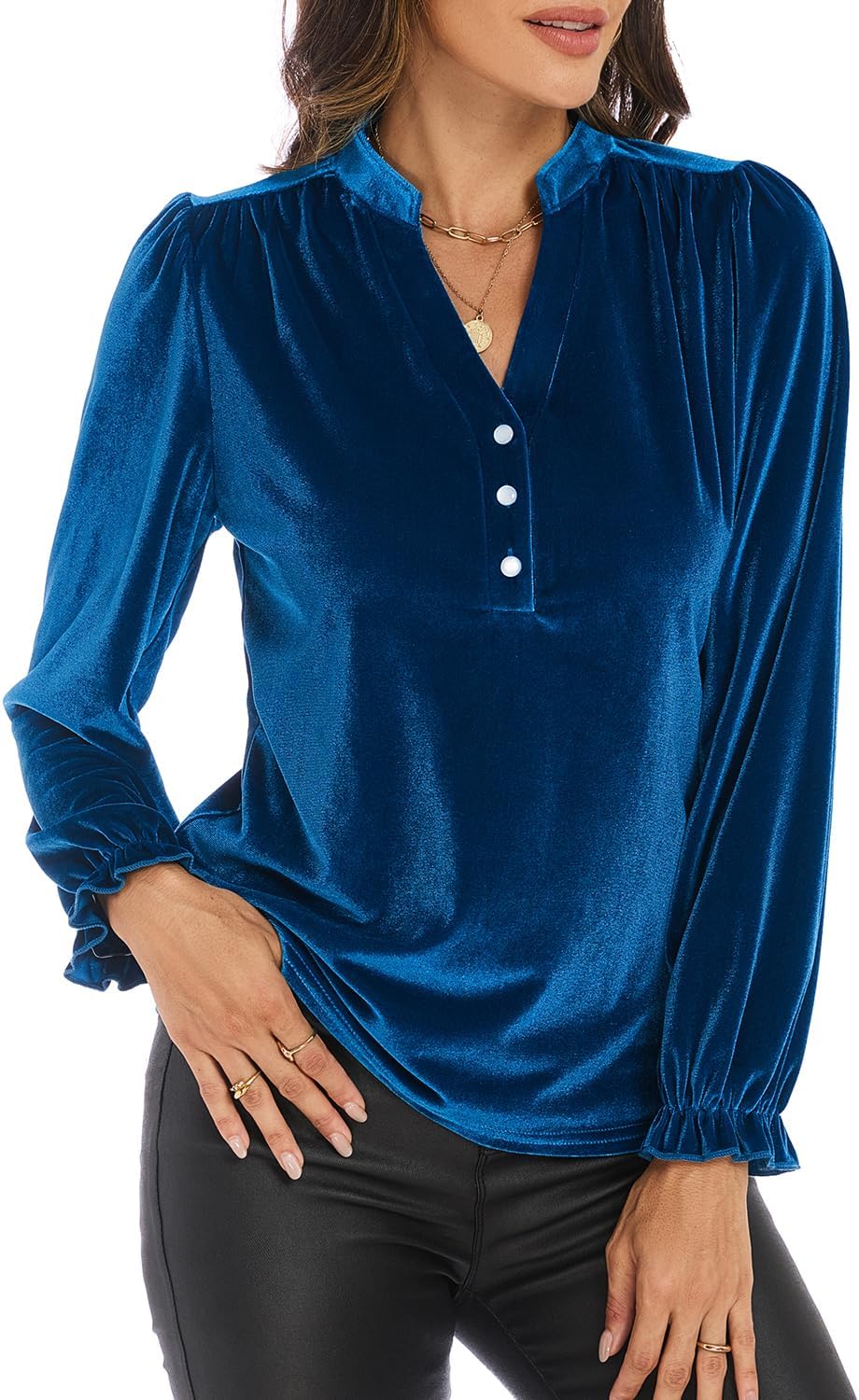 Women's Velvet Tops Puff Long Sleeve V Neck Ruched Fall Winter Trendy Christmas Formal Evening Party Holiday Shirts Blouse