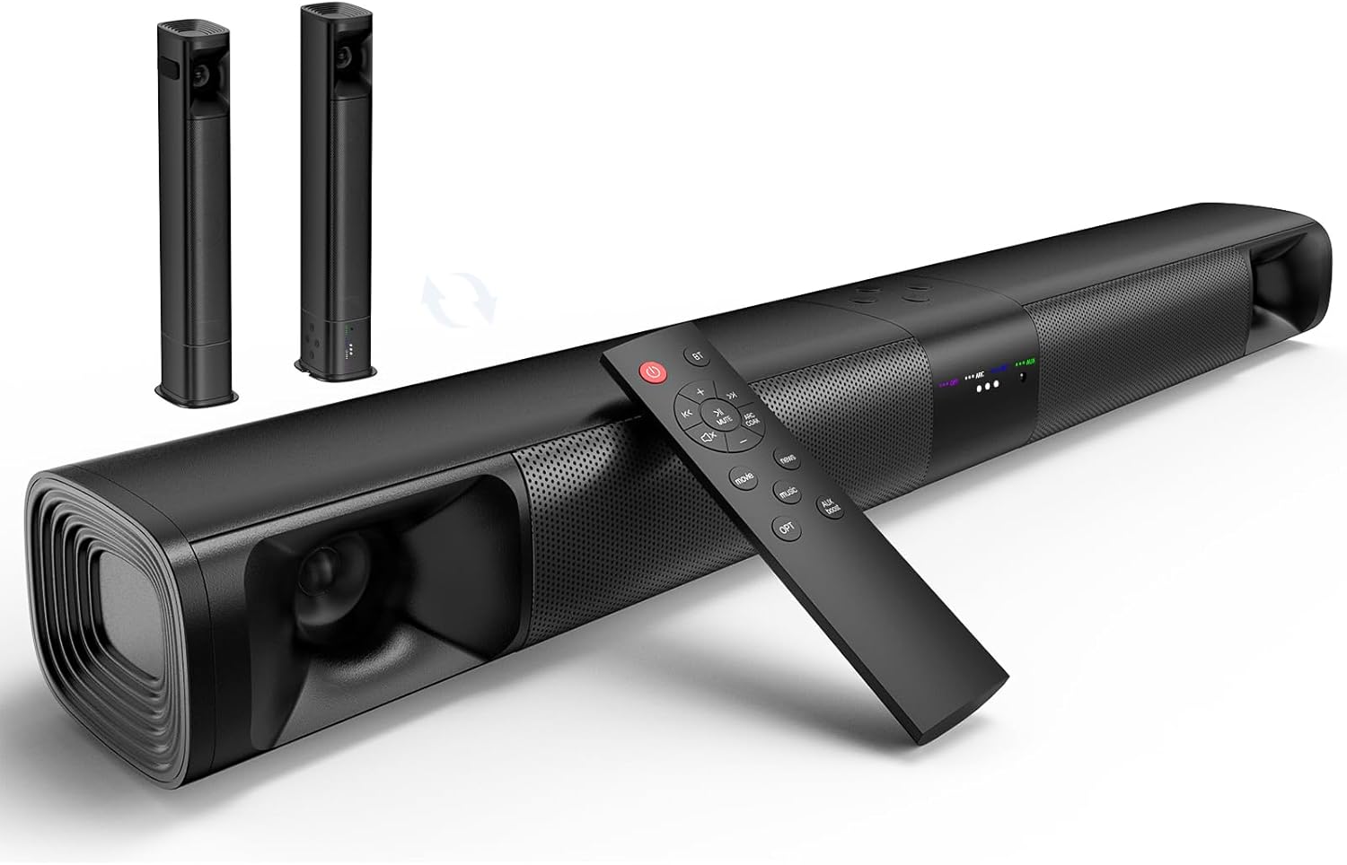 - Theater-Grade Experience: Say goodbye to thin TV audio. This premium soundbar instantly transforms your living room into a private cinema. Its built-in four-driver subwoofer delivers deep, powerful bass, while dual tweeters ensure crystal-clear dialogue and transparent highs. Whether watching movies or listening to music, enjoy immersive surround sound far surpassing built-in TV speakers.