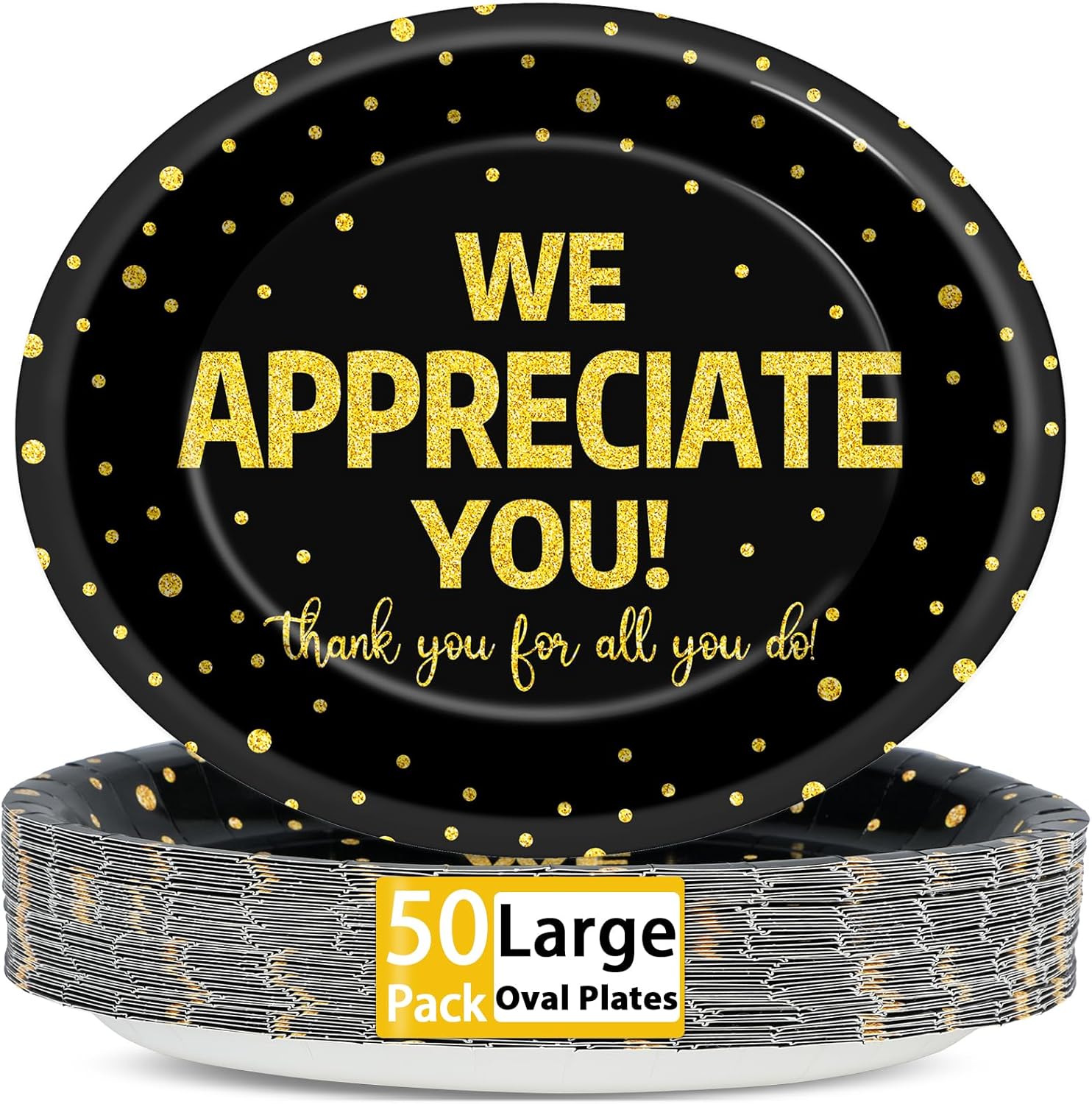- 50pcs we appreciate you party oval paper plates: Thank you party supplies set includes a total of 50 pieces of oval paper plates. Enough quantity to make a good for your daily use. We appreciate you party supplies can easily accommodate up to 50 guests for your graduation celebrations, employee recognition events, Teacher Appreciation Day, or Nurses Week.