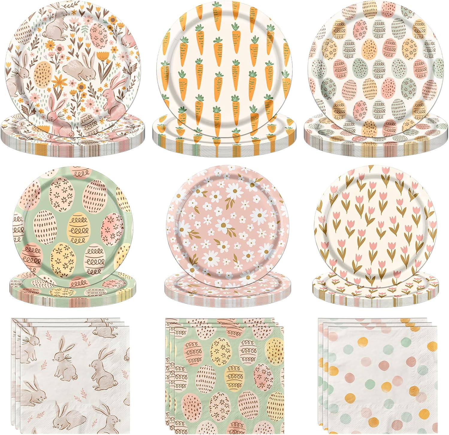 - 【Easter Theme】Our Easter paper plates and napkins sets feature cute Easter bunnies, colorful Easter eggs and carrots, that is embellished with blooming daisies and spring flowers and polka dots. Fantastic design creates a strong festive atmosphere for Easter party.