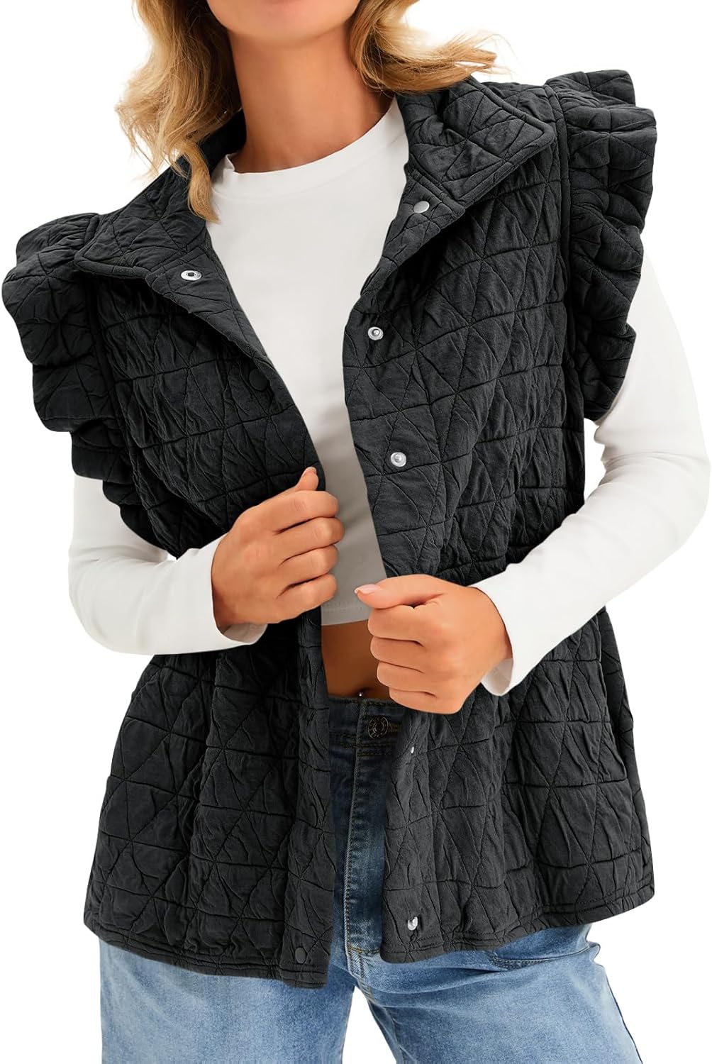 Cicy Bell Women Ruffles Puffer Vest Sleeveless Button Down Padded Jacket Gilet Trendy Spring Outerwear