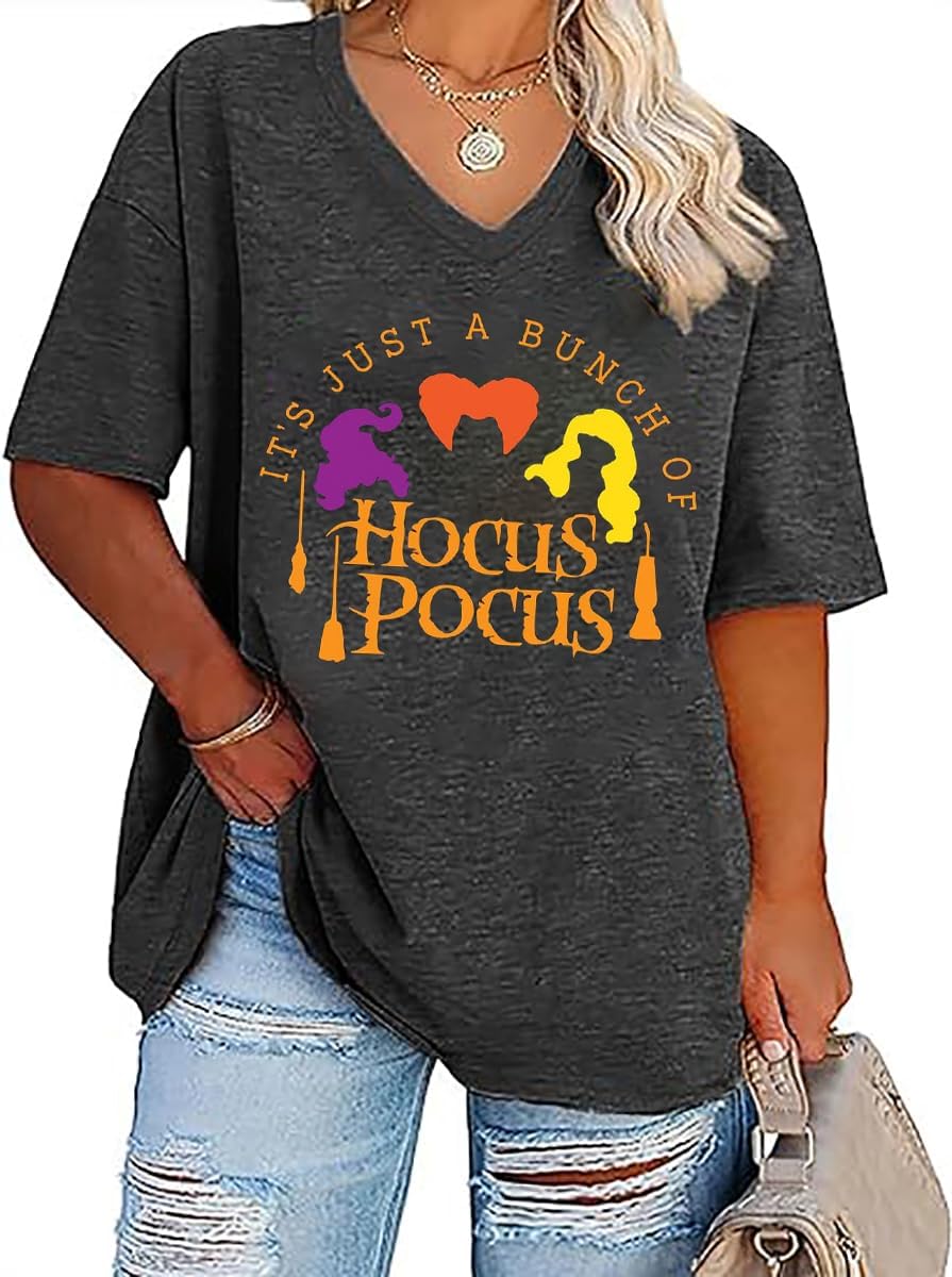 Plus Size V-Neck Halloween T Shirt Women Vintage Graphic Hocus Pocus Tees Casual Loose Fall Holiday Shirts Tops