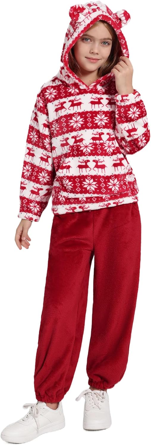 Girls 2 Piece Outfits Cozy Fleece Bear Ear Hoodie Sweatshirt & Sweatpants Set Fall Winter Warm Sweatsuit for Kids 6-14Y