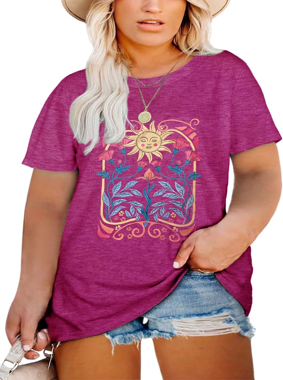 Plus Size Tops for Women Vintage Floral Graphic Tee Shirts Crewneck Short Sleeve Cozy Comfy Casual T-Shirt