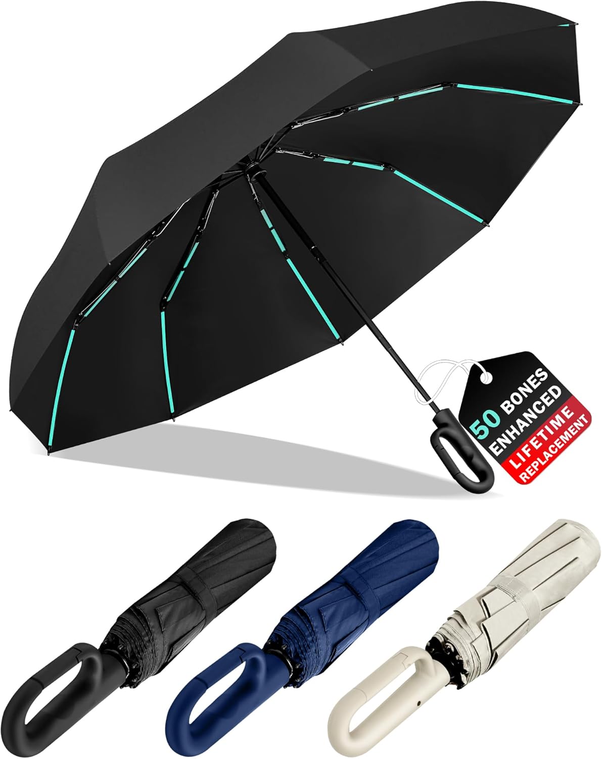 10-Shaft & 50-Rib Reinforced Windproof Umbrella, Automatic Open/Close with Carabiner Handle, Heavy-Duty Storm Resistant Umbrella for Rain and Wind, Compact Travel