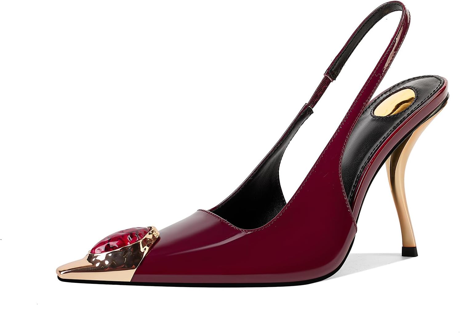 USRUNOE Rhinestones Slingback Kitten Heels Pointed Closed Toe Pumps for Women, Stiletto 4Inch High Heeled Sandals for Dress Shoes,Burgundy 9