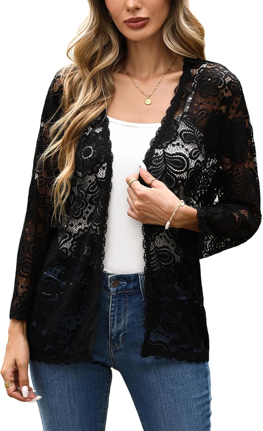 Women's Floral Lace Shrug Cardigan 3/4 Sleeve Lightweight Crochet Open Front Cardigans Tops