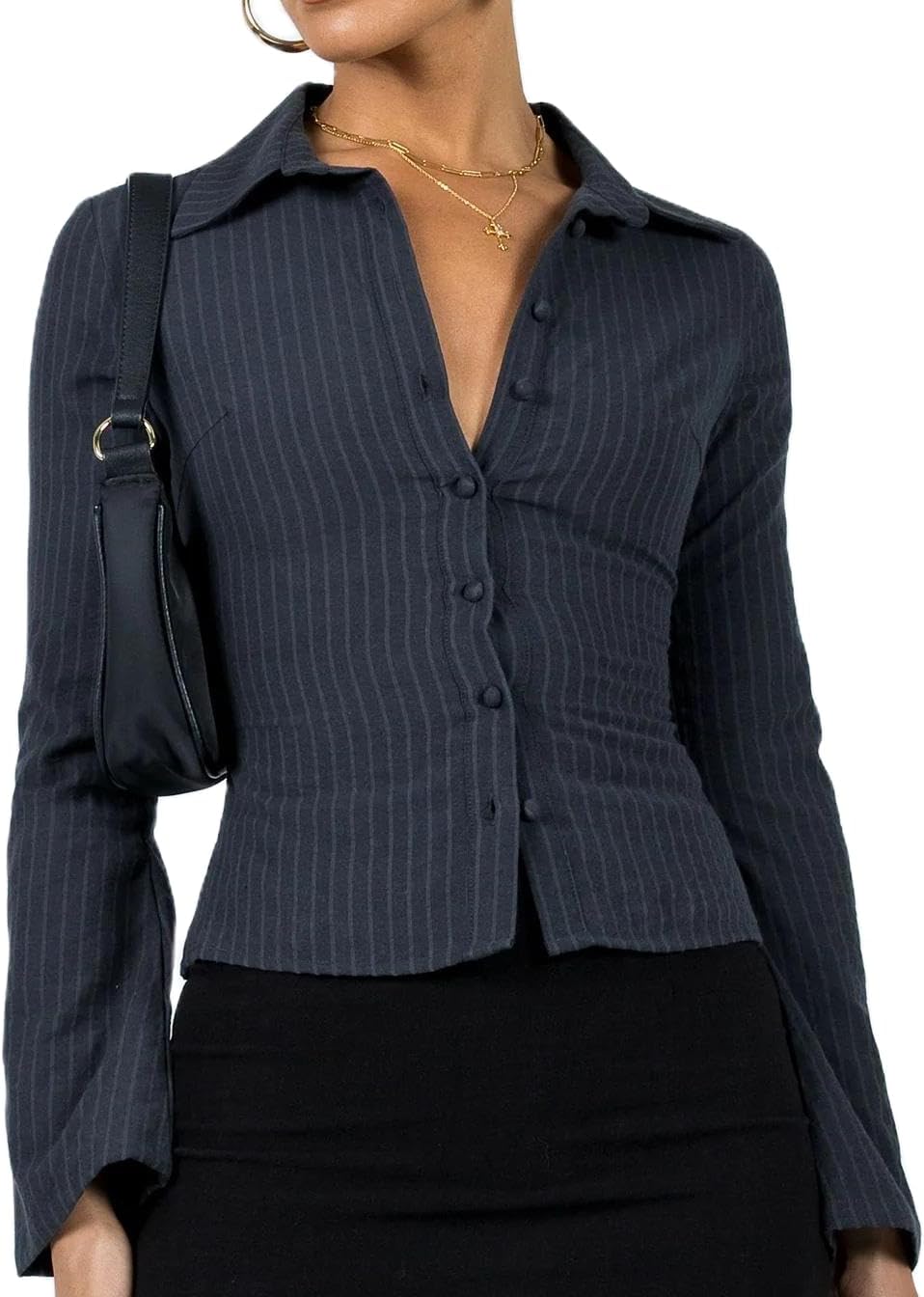 Women Pinstripe Shirt Flared Long Sleeves Button Down Fitted Crop Shirts Blouses Business Casual Top