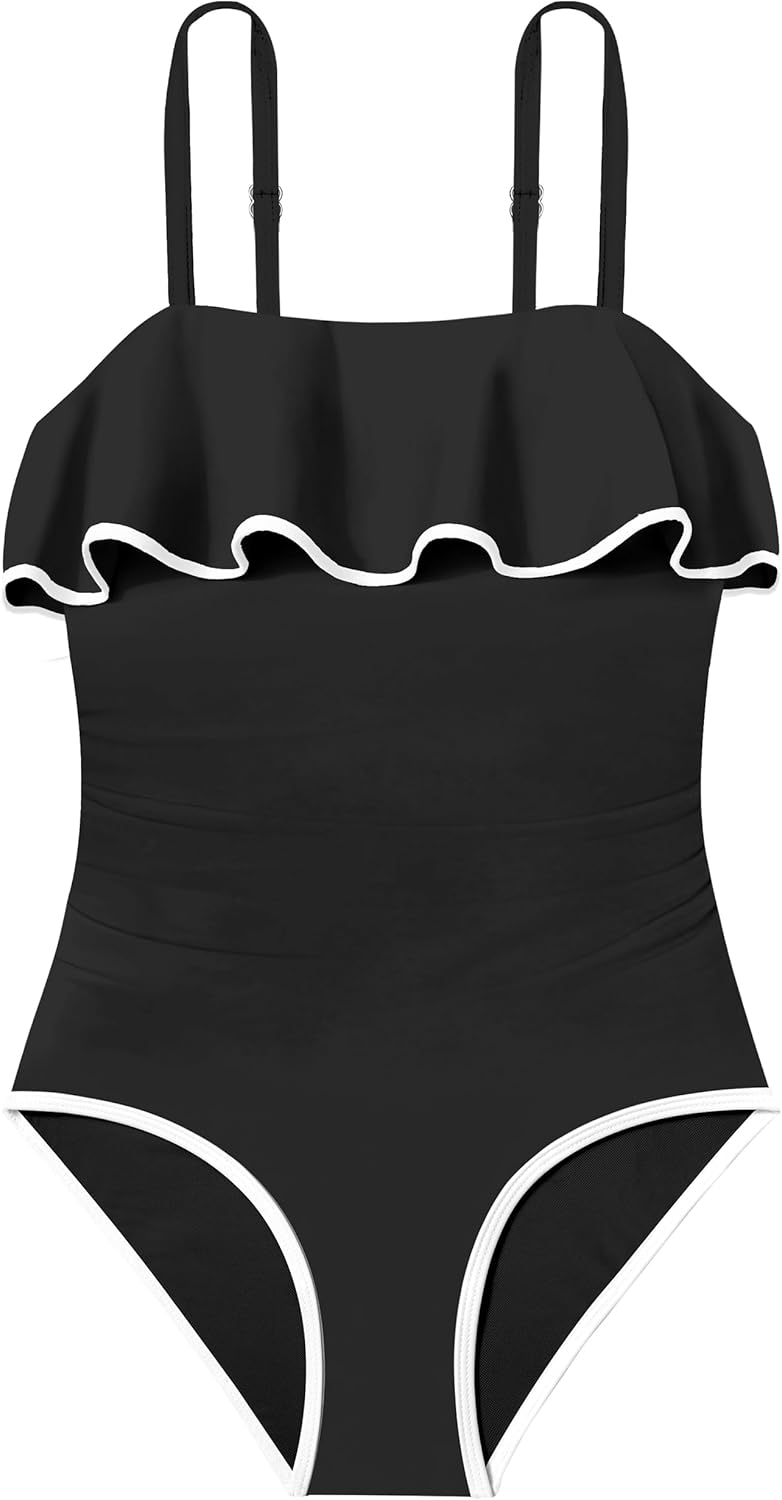 Girls Swimsuit Ruffle One Piece Swimsuits Solid Color Bathing Suit for Teens Contrast Trim Swimwear 9-16Y with Padded