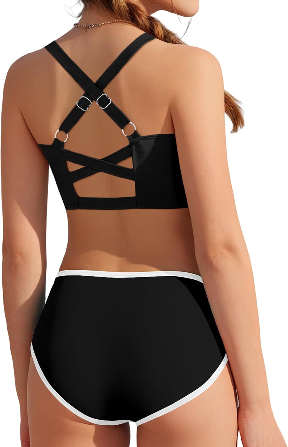 Girls Swimsuit Two Piece High Waist Athletic Piping Girls Bathing Suit Cute Fashion Classic Bikinis Set Kids Swim Suits