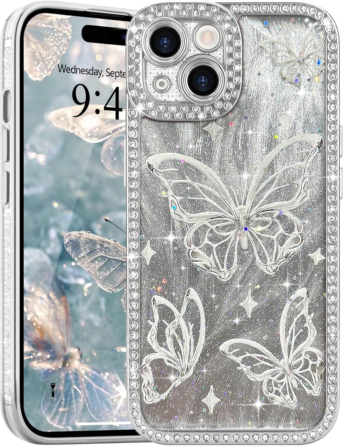 for iPhone 15 Plus Bling Butterfly Case, Cute Luxury Sparkle Glitter Diamond Crystal Rhinestone Protective Case Cover for Girls Women Kids for iPhone 15 Plus/iPhone 14 Plus 6.7 Inch,Silver