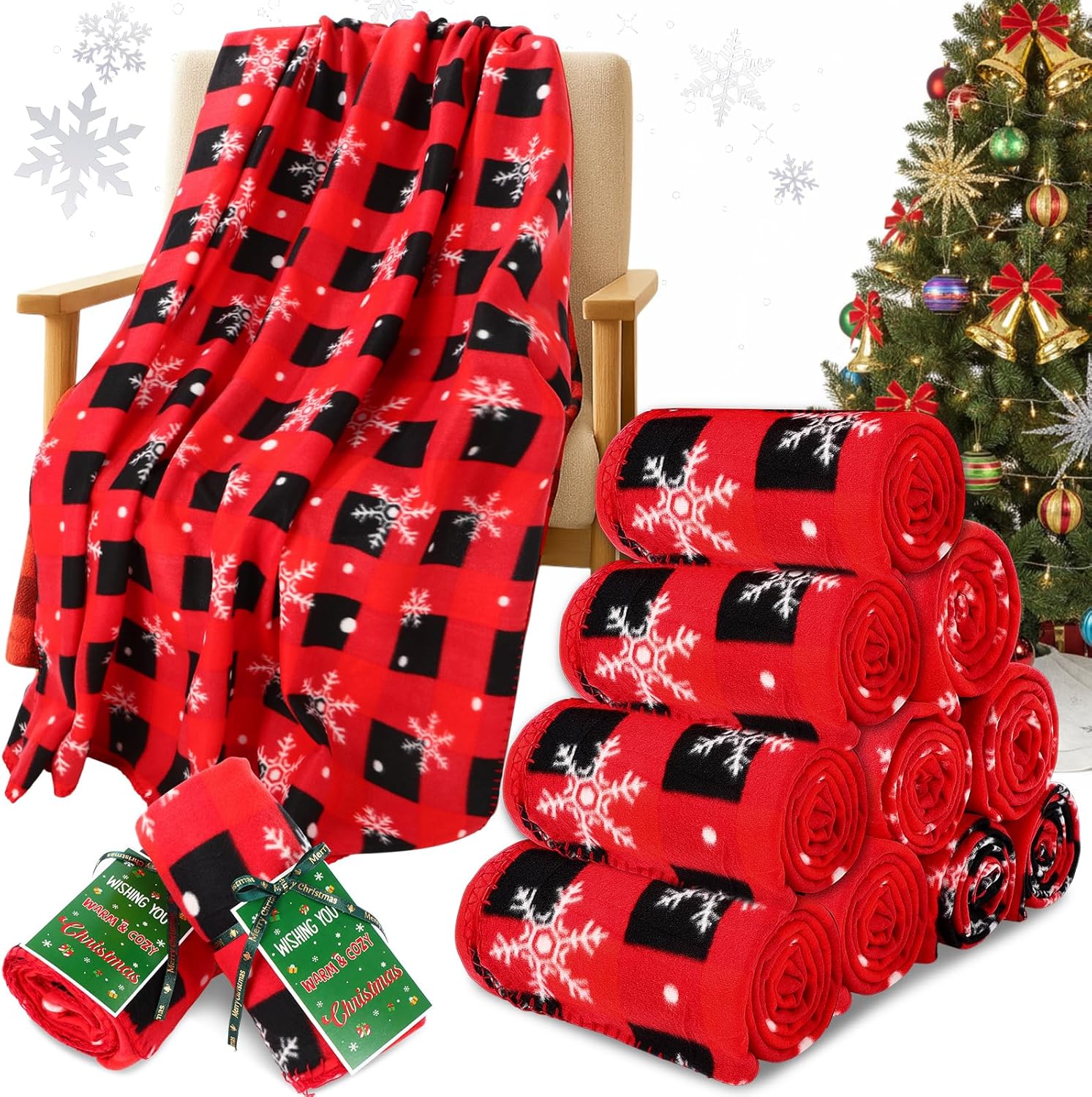 - Complete Christmas Gift Set: elevate your holiday gifting with this complete set of fleece Christmas blankets; It includes 12 delightful holiday blankets in snowflake designs; 12 Merry Christmas ribbons (1 yard each), and 12 Christmas gift cards; Ideal for Christmas parties, secret Santa exchanges, or family gatherings